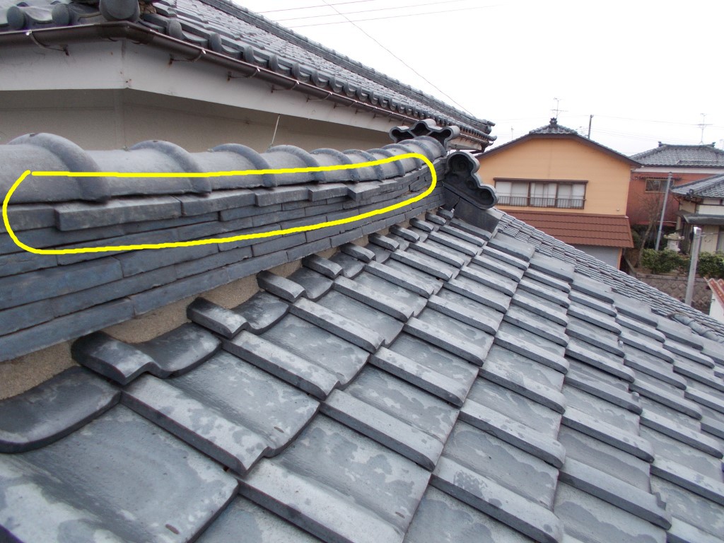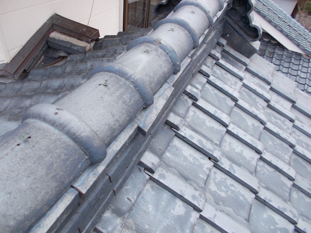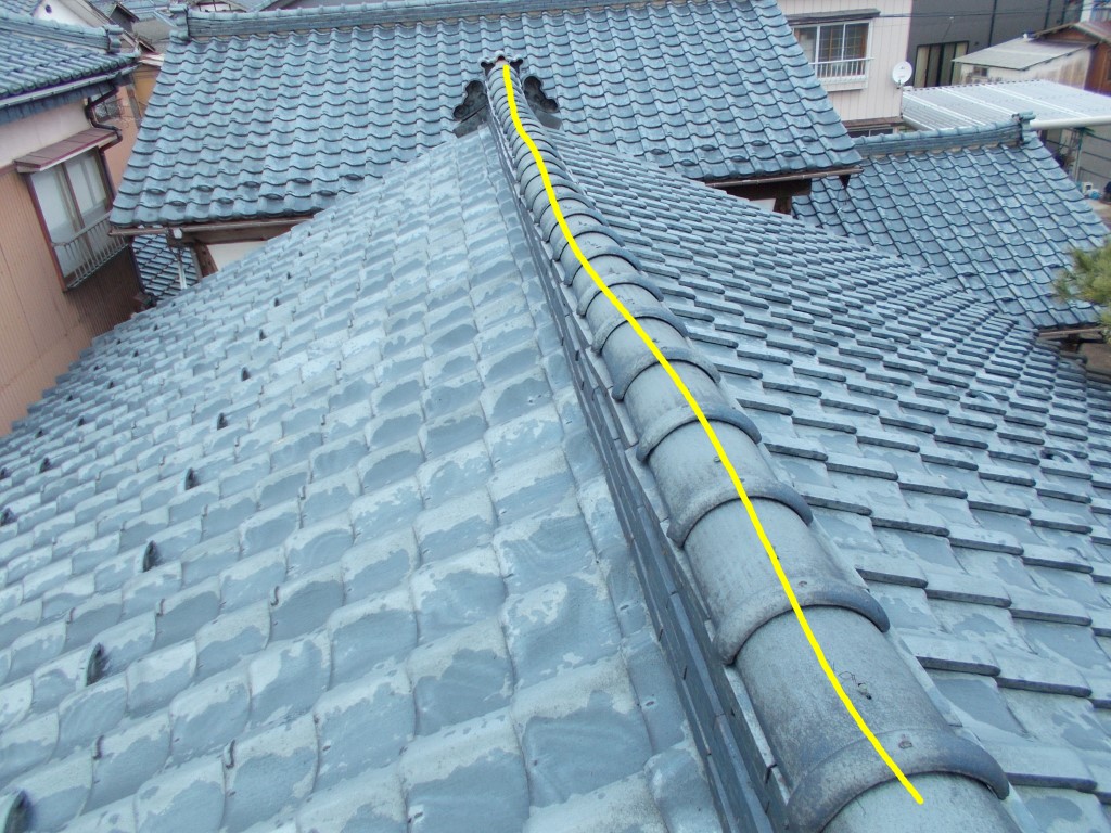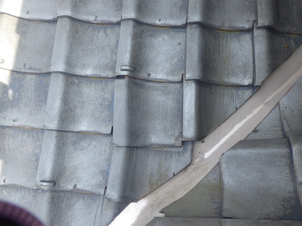 1Fの屋根も同様に、本棟(ほんむね)の のし瓦のズレや脱落、谷瓦のズレもみられます。