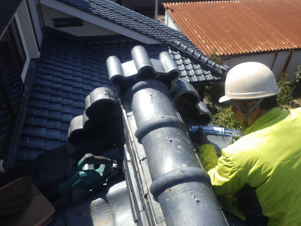 こちらの本棟は のし瓦が6段積まれた棟でしたが、幸いなことに 下段の4段分は地震の被害がありませんでした。