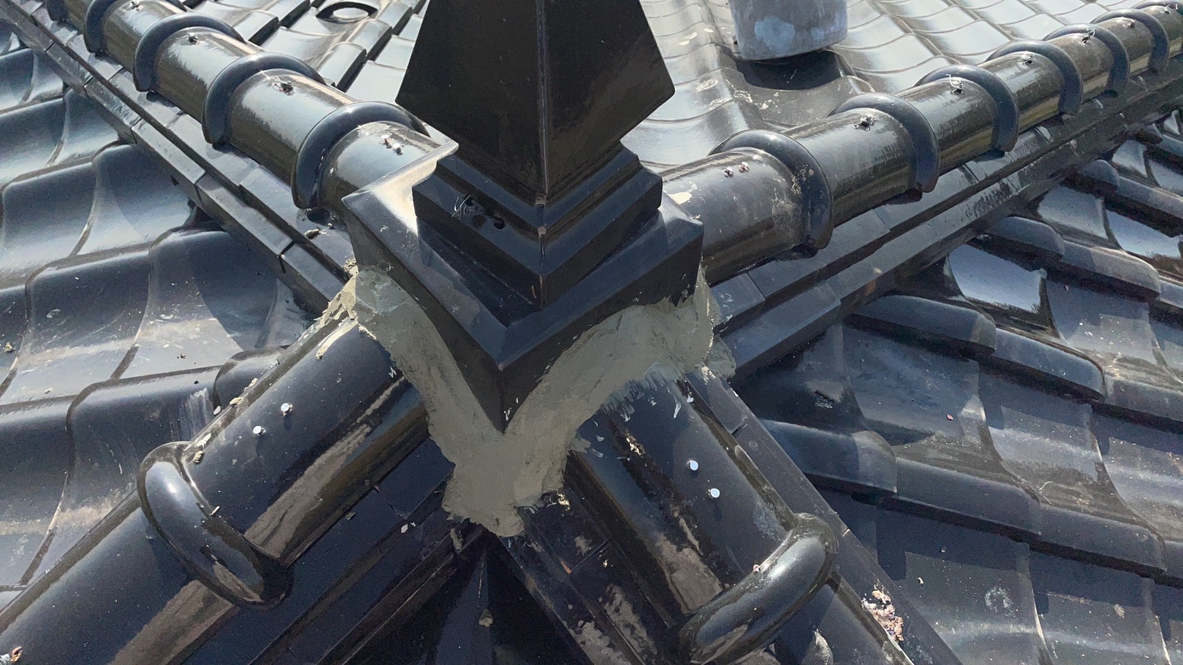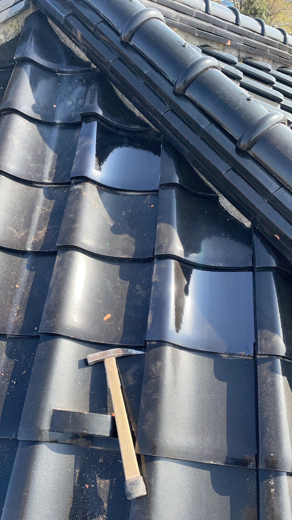 この瓦は 愛知県 三州瓦(さんしゅうかわら)のブラック色で、ツルツル滑る瓦です。作業に注意しながら進めていきますが、部分的に交換が可能な点は 瓦のもつ大きなメリットのひとつです。
