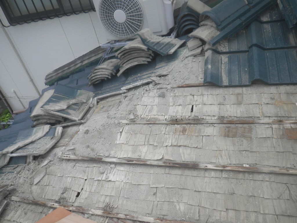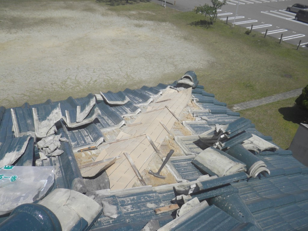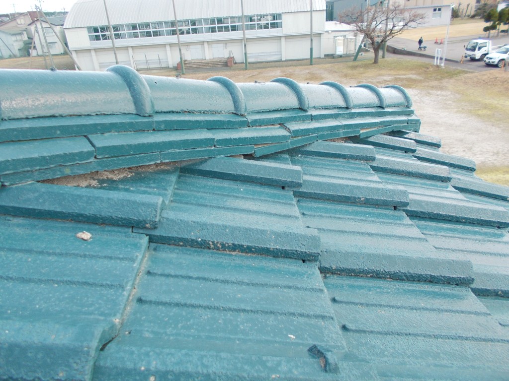 写真ではわかりにくいのですが、写真中央付近の瓦の列が水上方向へ沈み込んでいます。