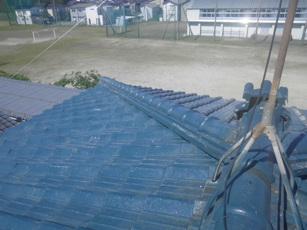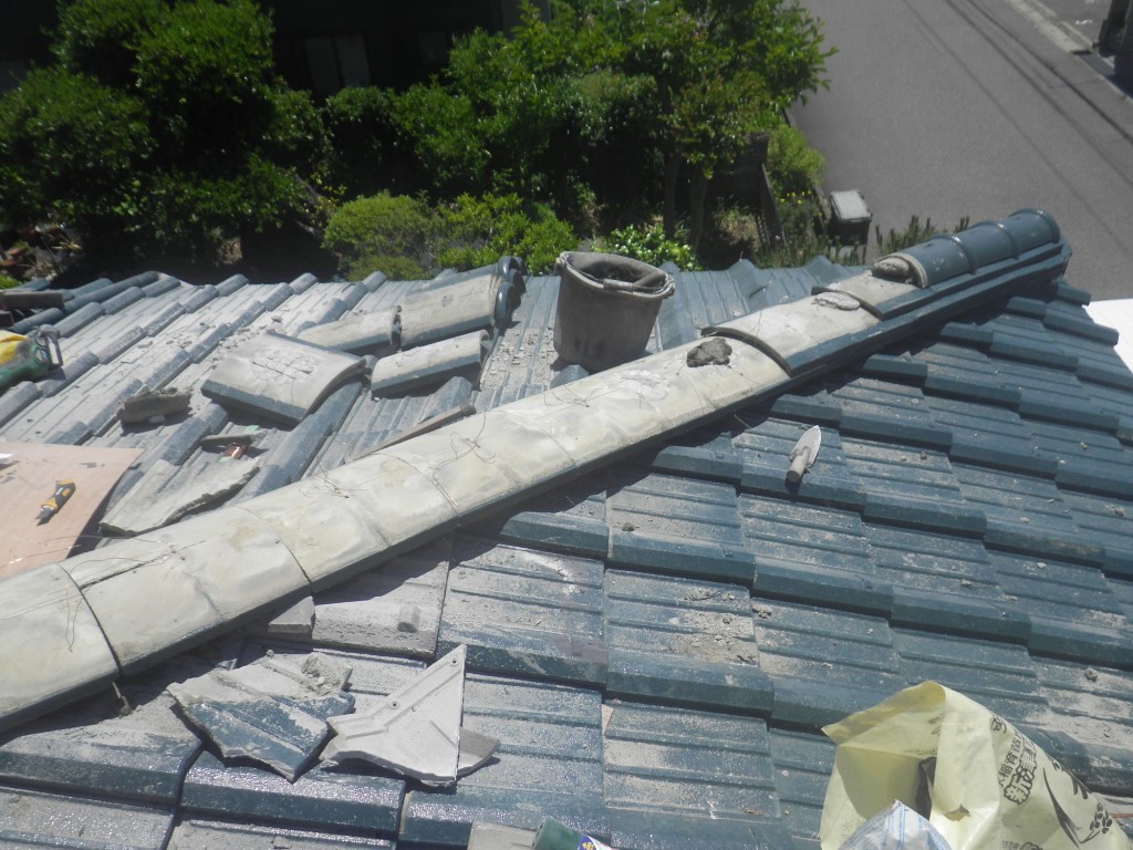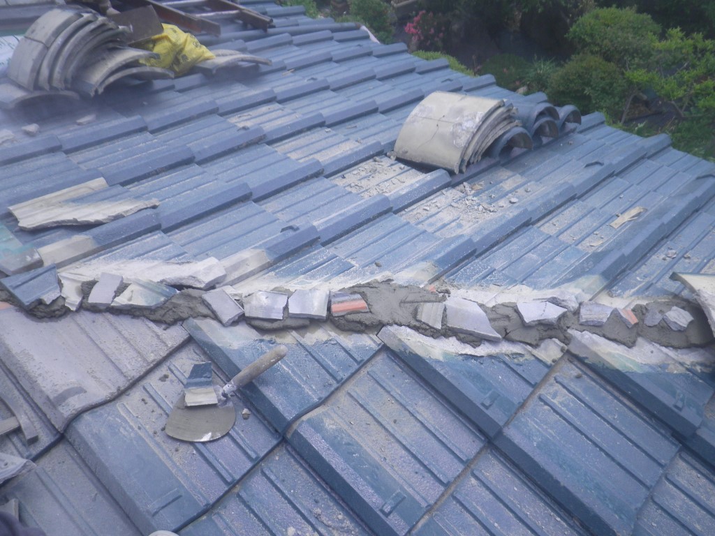 それに伴い のし瓦のズレが発生して、ところどころで隅棟が崩れそうです。多少なりとも地震の影響があったと思われます。