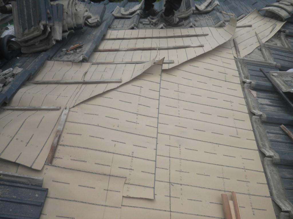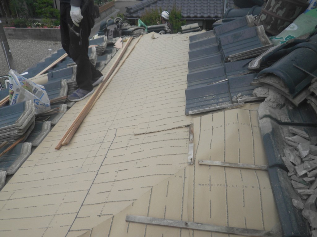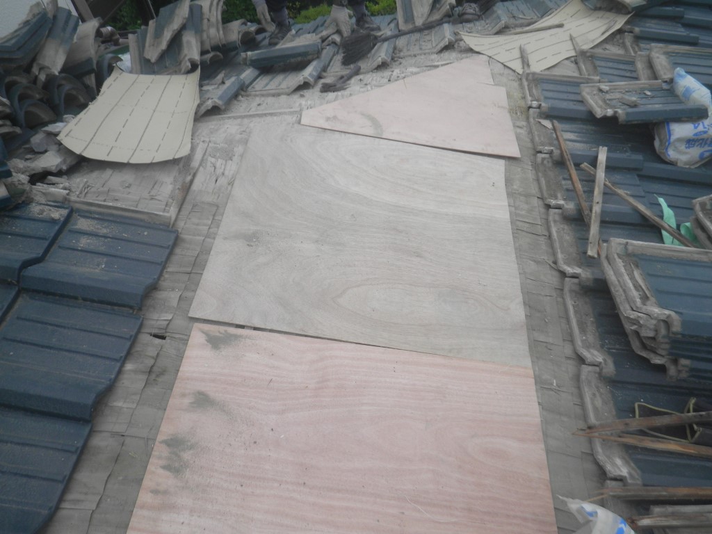 この部分の雨漏りの原因は 瓦そのものではなく、屋根の不陸が主因ですので まずは耐水性のベニヤを貼って野地の不陸を修正します。